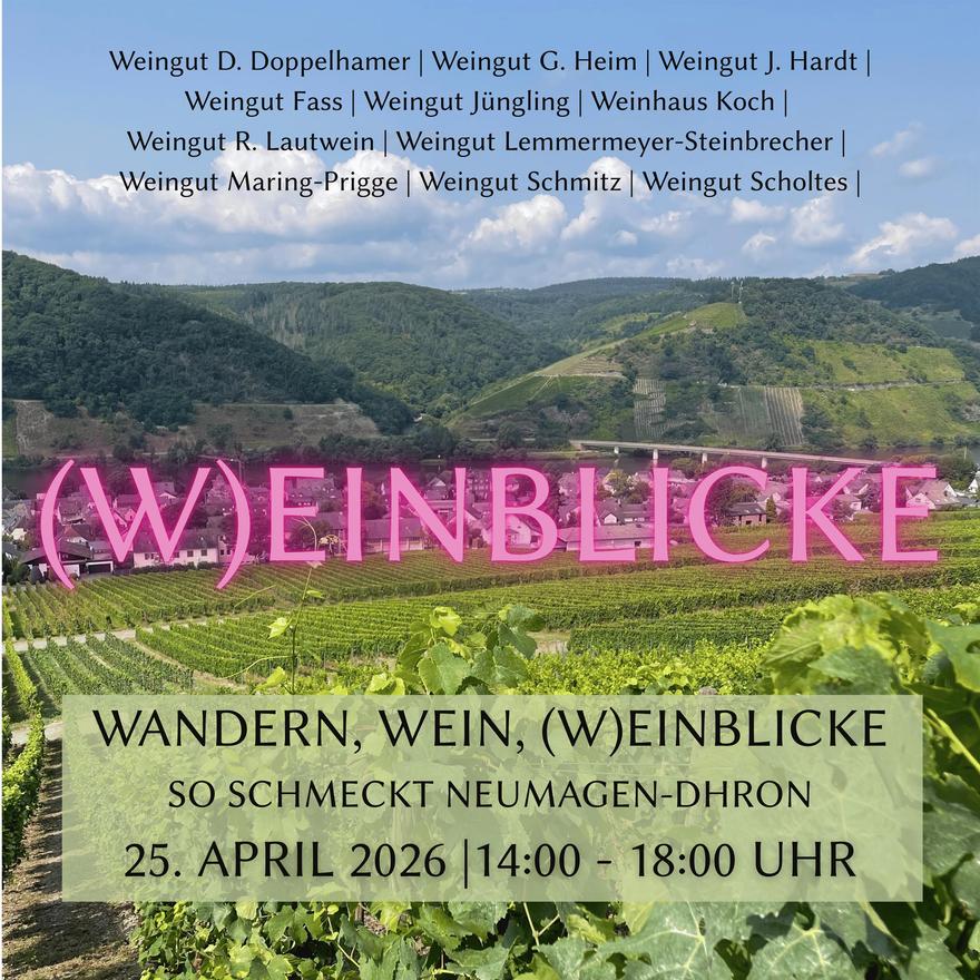 Unter dem Motto „Wandern, Wein, (W)EINBLICKE – so schmeckt Neumagen-Dhron“ laden die Neumagen-Dhroner Winzer zu einer weinkulturellen Wanderung ein. Entlang der Strecke erwarten Sie die Winzer an verschiedenen (W)EINBLICKE-Stationen – im Ort, vorbei am Weinschiff sowie durch die umliegenden Weinberge. Genießen Sie die Weine dort, wo sie entstehen, und entdecken Sie Neumagen-Dhron aus neuen Perspektiven.